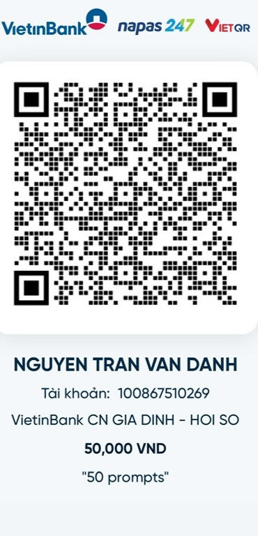 BƯỚC 1: Chọn gói (20/50/100 prompts)BƯỚC 2: Quét QR tương ứngBƯỚC 3: Gửi xác nhận Zalo + ghi rõ ngành nghề + số lượng đã mua